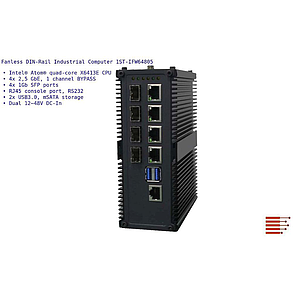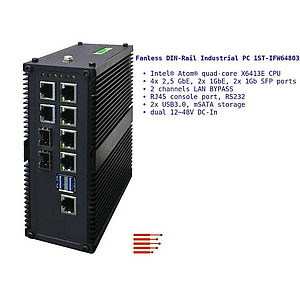 Lüfterloser DIN-Rail Industrie-Computer mit Intel® Atom® X6413E CPU, DDR4 SO-DIMM Slot bis zu 32GB, 4x 2.5GbE, 1x Kanal BYPASS, 4x 1Gb SFP Ports, RS232, RJ45 Konsole Port, 2x USB3.0, mSATA Speicher, HDMI, 2x 12~48V DC-In, -40°C ~ 60°C.