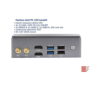 Lüfterloser Mini-PC mit Intel® Elkhart Lake Celeron® J6412 Quadcore CPU, 2,0 bis 2,6 GHz mit 10W TDP, 2x SO-DIMM DDR4-3200 Slots für max 32GB RAM, 2x Gb LAN (RTL8111H), 2x HDMI2.0, 2x USB 2.0, 2x USB 3.2 Gen 2, 1x USB Type-C (USB3.2 Gen 2), 1x M.2 Key B Slot für 2242/2280 SATA-SSD oder 4G Modul, optional 1x SATA, 1x M.2 Key E für 2230 WLAN & BT, Mikro-SIM-Slot, 12V DC Spannungseingang, Abmessungen: 127 x 127 x 43,5 mm. Betriebstemperatur -20°C ~ +60°C, kompatibel mit Windows 10/11 64 bit, Linux 64 bit, 24/7.