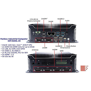 Lüfterloser embedded 24/7 PC mit Intel® Core™ i3/i5/i7 CPU, bis zu 64GB DDR4 SO-DIMM, 2x GbE, 4x USB3.2, 4x USB2.0, 2x HDMI™ 2.1, SATA3.0, 2x M.2 für SSD/4G, M.2 für WLAN support PCIe & Intel® Integrated Connectivity (CNVi), 6x COM RS232/RS485/RS422, 9V-35V DC-Spannungseingang.