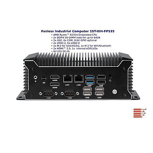 Lüfterloser embedded 24/7 PC mit AMD Ryzen™ R2314 CPU, bis zu 64GB DDR4 SO-DIMM, 2x GbE, 2x USB3.2, 6x USB2.0, 2x HDMI™ 2.0, 1x internal eDP/LVDs, 1x M.2 für SSD/4G/5G und SATA3.0 FPC, M.2 für WLAN & Bluetooth, 6x COM RS232/RS485, 9V-35V DC-Spannungseingang