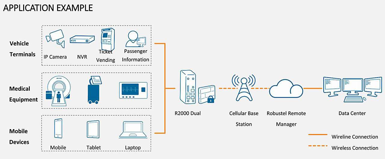 Robustel 2000 Dual FDD LTE Router mit Dual-SIM, optional Dual 4G-Modul, 4x Fast-Ethernet mit PoE, 1x WAN, 9-57V DC, FDD LTE Cat4, DL/UL: 150/50 Mbps;